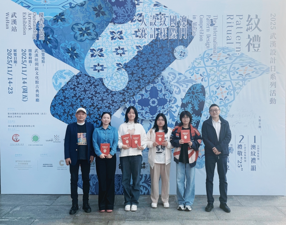 2025年11月14日,我院艺术与科技系3名学生将“汉艺智能与创新设计大赛——汉口记忆专项赛事”的设计成果与澳门纹样与当地标志性建筑相融合进行艺术创作。作品成功入选「纹・礼」澳门国际纹样设计大赛“创作新星奖”,并在南太子湖创新谷·武汉站现场展览。